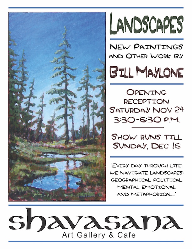 “Art Opening! it’s a new season and Shavasana Gallery is gearing up for it’s pre-winter show! Bill Maylone has created a stunning new collection of oil and acrylic paintings* which will be on display from Nov. 22 thru Dec. 16 – we are having an Opening on Saturday Nov. 24 from 3:30 – 6:30, please drop by then for a chance to meet the artist! Refreshments will be served!