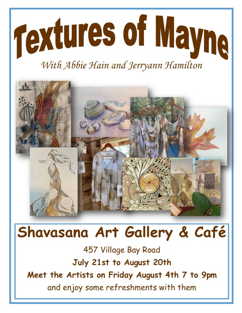I’m pleased to announce that artists Jerryann Hamilton and Abigail Hain, will be displaying their talents on the walls of Shavasana Gallery from July 22 – Aug 20. Their show is called “Textures of Mayne” and will showcase their beautiful creative expressions on a variety of media including fabric, paper and canvas.