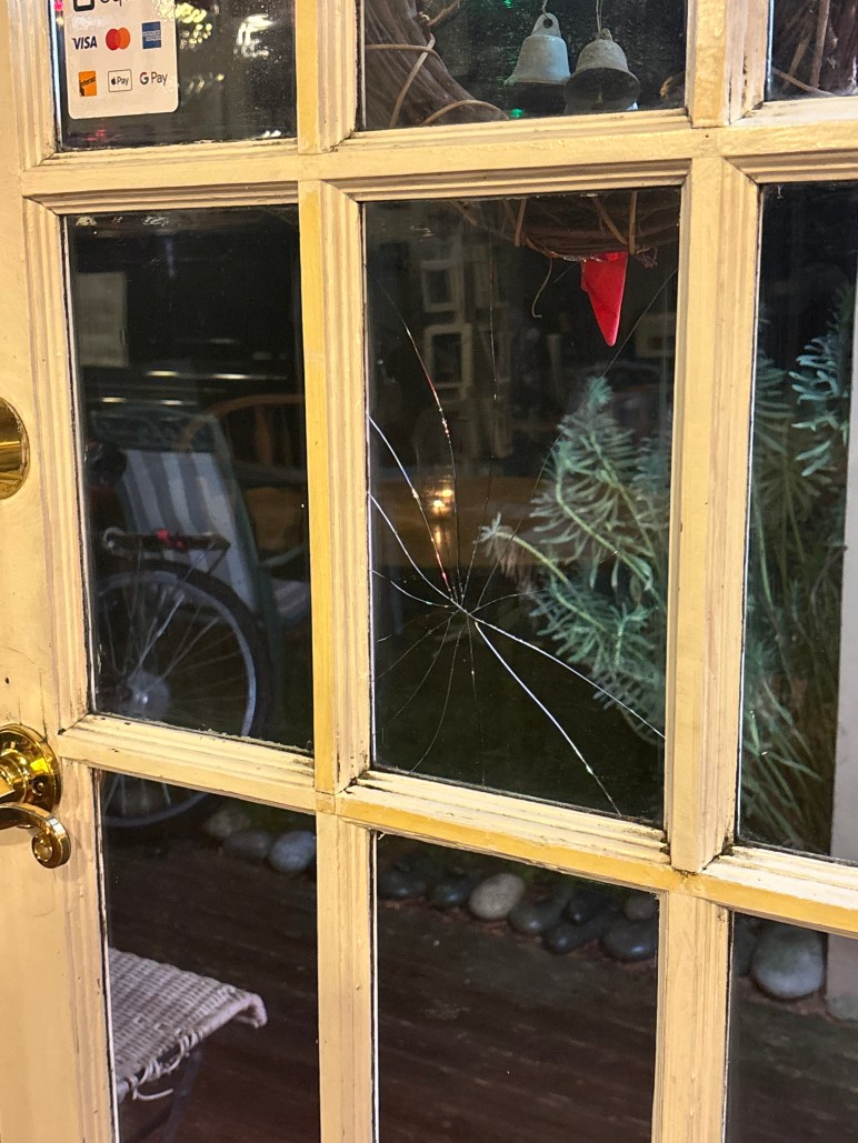 I was on the ferry making my way over to Mayne when I got a text from Anita, wondering if there had always been a cracked pane in the front door of Shavasana. While setting up shop, going in and out to her car, the door was left open for a minute(with a doorstop)and a huge gust of wind slammed it shut resulting in a cracked pane of glass. Without wasting a moment, she called Bill Jamieson, and