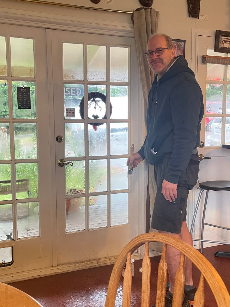 After a little site-prep by Richard on the Monday, Bill came back with a perfect cut of glass on Tuesday and Richard finished the job, secured the frame and painted it such as you’d never know it had been broken.