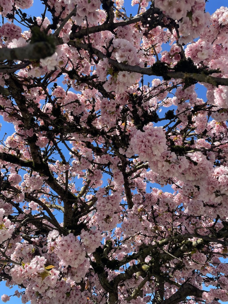 Gorgeous cherry blossom season this year – I didn’t realize that there were (are) two main varietals here in Kitsilano…the first shows up early with a beautiful lighter pink display but sheds its petals quite quickly – most were gone in a week and it looked like cherry blossom season was over. Then, these lovely dark pink blossoms appeared, on shorter knobbier trees with robust clusters of blossoms which show no signs of leaving – they’ve been hanging around for at least a couple of weeks, cheering up these cool cloudy days.🙏