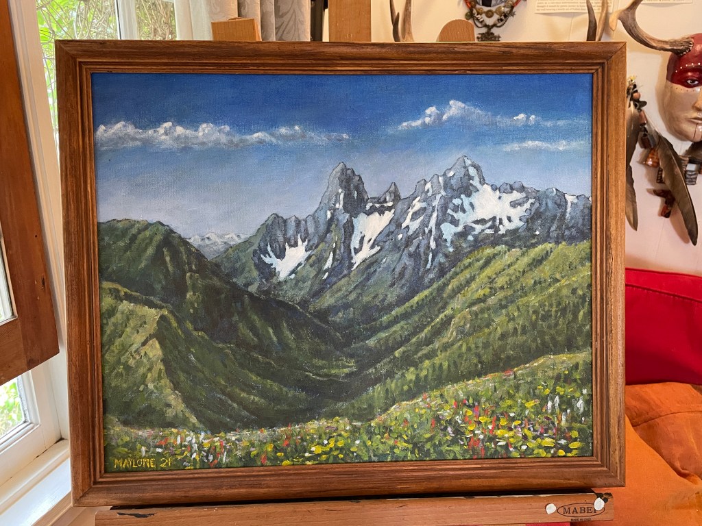 We hung the show several days ago (Sept 15) and it always goes smoothly when assisted by the calm hand and careful measurements of Empty Sky’s personal hanger – her husband Jim Heshedahl! As well as being an accomplished art hanger Jim is also a fabulous musician and will be providing background music the night of the show with “The Rambling Truths” (which includes Gail Noonan and myself – see poster above). *Rumour has it that Jim may also be celebrating a “Special Birthday” on the night of the party – Sept 30th….shhh!😆