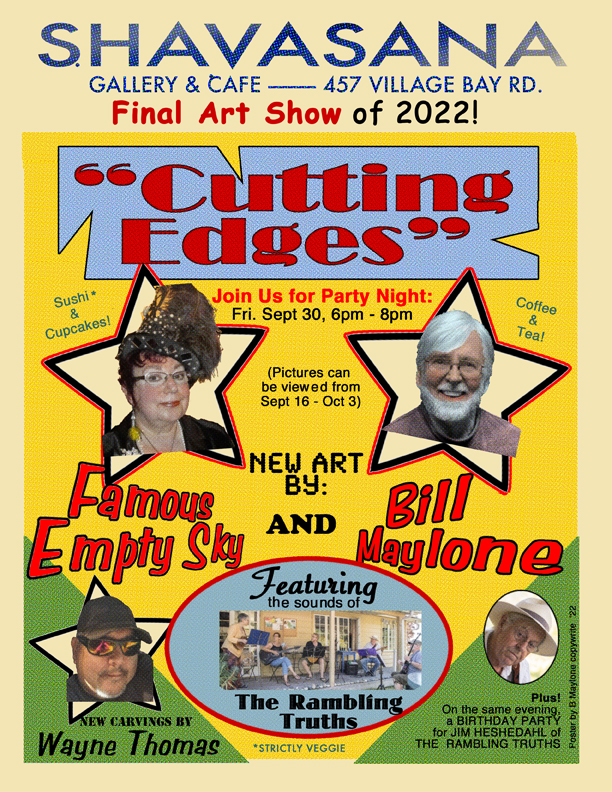 So please set aside Friday September 30, 6pm – 8pm to come on down to Shavasana Gallery & Café (457 Village Bay Road, Mayne Island) for a great evening of art, conversation, food, drinks, music and fun!