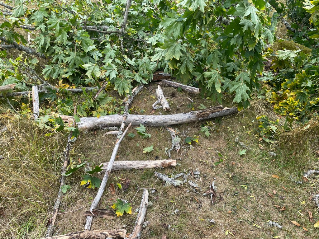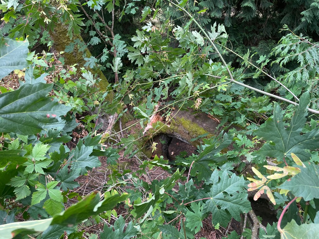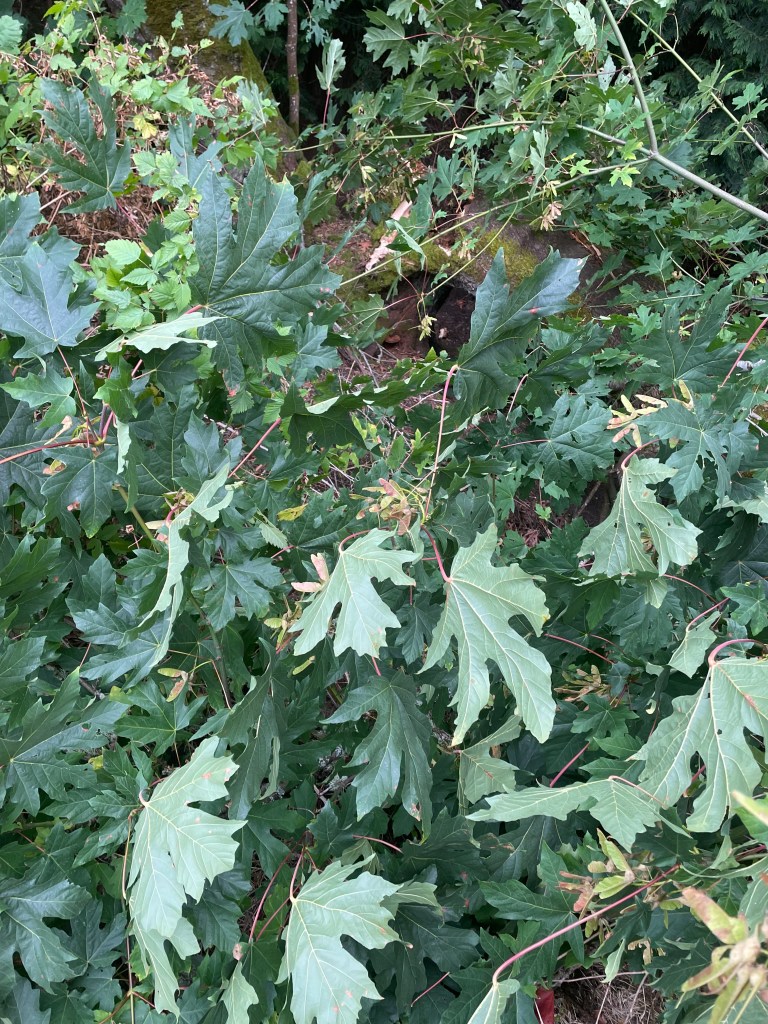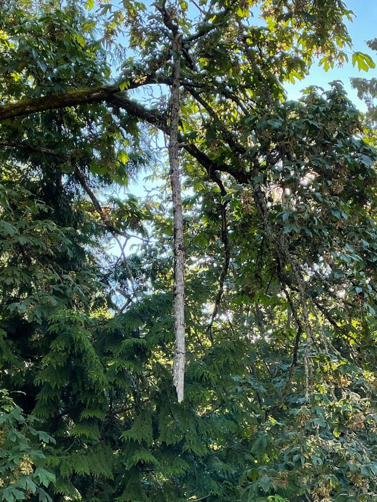 A widowmaker (or “Fool Killer” as Mr. Google also calls them🤣) is a term used to describe a broken branch that is suspended in the air and stuck on a part of another tree. I learned this term from my brief stint working for Macmillan Bloedel, in Port Hardy back in the 70’s. These branches can be extremely dangerous and can fall at any time posing a lethal threat to anyone who might be standing underneath. I became aware of the widowmaker, hanging off this maple tree, when I first arrived on the property 12 years prior, and always made a point of pointing it out to anyone using the trail or doing work in the vicinity.
