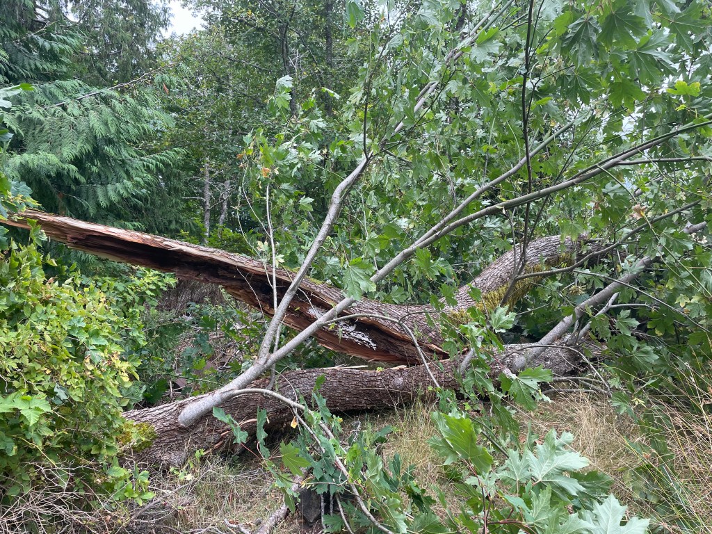 I have been in the vicinity of several tree crashes in my dozen years on Mayne Island and it always starts with the initial “crack” which grows in intensity – depending on the girth of the tree and the trajectory of its fall. Upon hearing this sound, our innate reptilian fear mechanism triggers an immediate sharpening of the senses, with a quick hunch, head spin, and echolocation to determine – in very short order – if we are going to die or if we have time for a second cup of coffee.