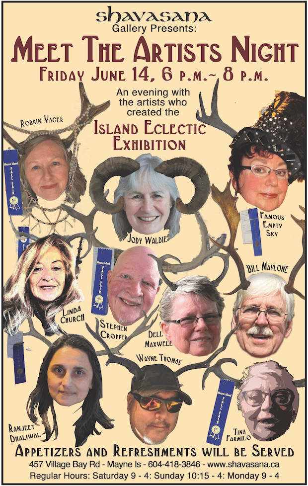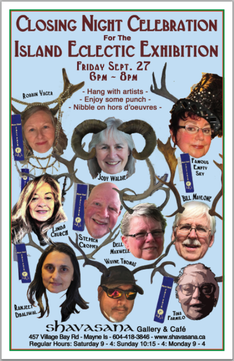 Our current exhibit – Island Eclectic – has been charming visitors to the Gallery for 5 months and we’ve decided it’s time to have an “end of season” party!* The original 10 artists which launched our season (Dell Maxwell, Bill Maylone, Linda Church, Ranjeet Dhaliwal, Stephen Cropper, Tina Farmilo, Robbin Yager, Jody Waldie, Wayne Thomas and Famous Empty Sky) were joined later in the summer by Joseph Loh, and, if I throw myself in the mix, we became the “Group of Twelve” sometime in August. From my perspective (as I spend a lot of time in the Gallery) I feel absolutely blessed to be surrounded by so much creative energy & beauty…it’s a pretty good gig!🙏